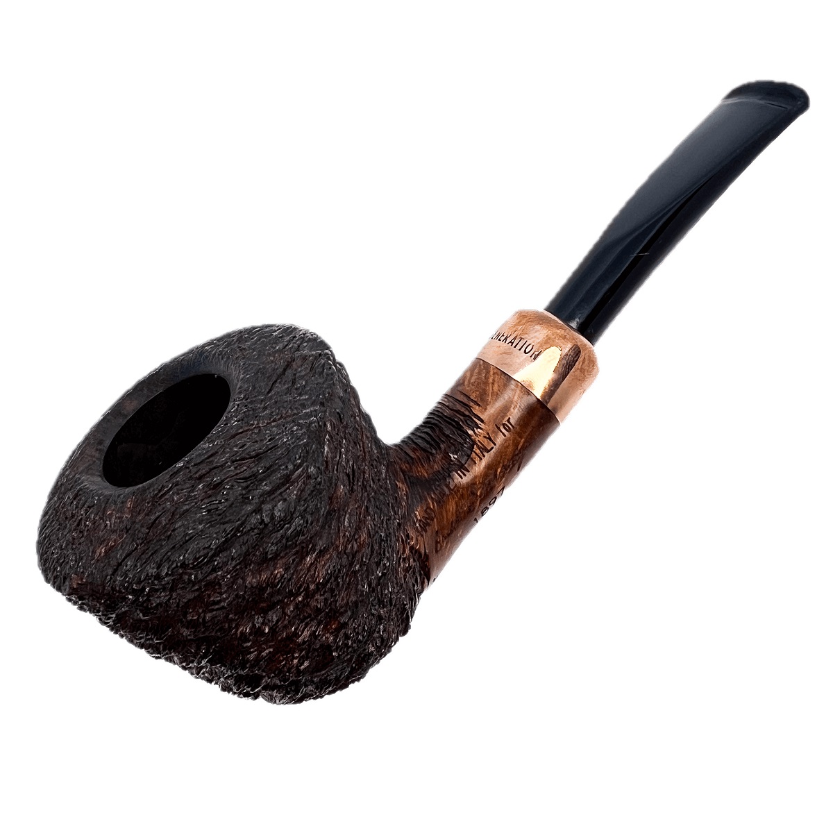 The 4th Generation “1897” Bent Pot, designed by Caminetto’s Ascorti for Erik Stokkebye, honors his grandfather Erik Paul, the second generation in the Stokkebye tobacco legacy. Featuring a muscular, broad bowl with thick walls and a slender shank-and-stem for elegant balance, it fits comfortably in hand. Part of the Forza series, it comes in four finishes—Nebbiolo, Fiano, Grappa, and Primitivo—each accented with a striking metallic band.