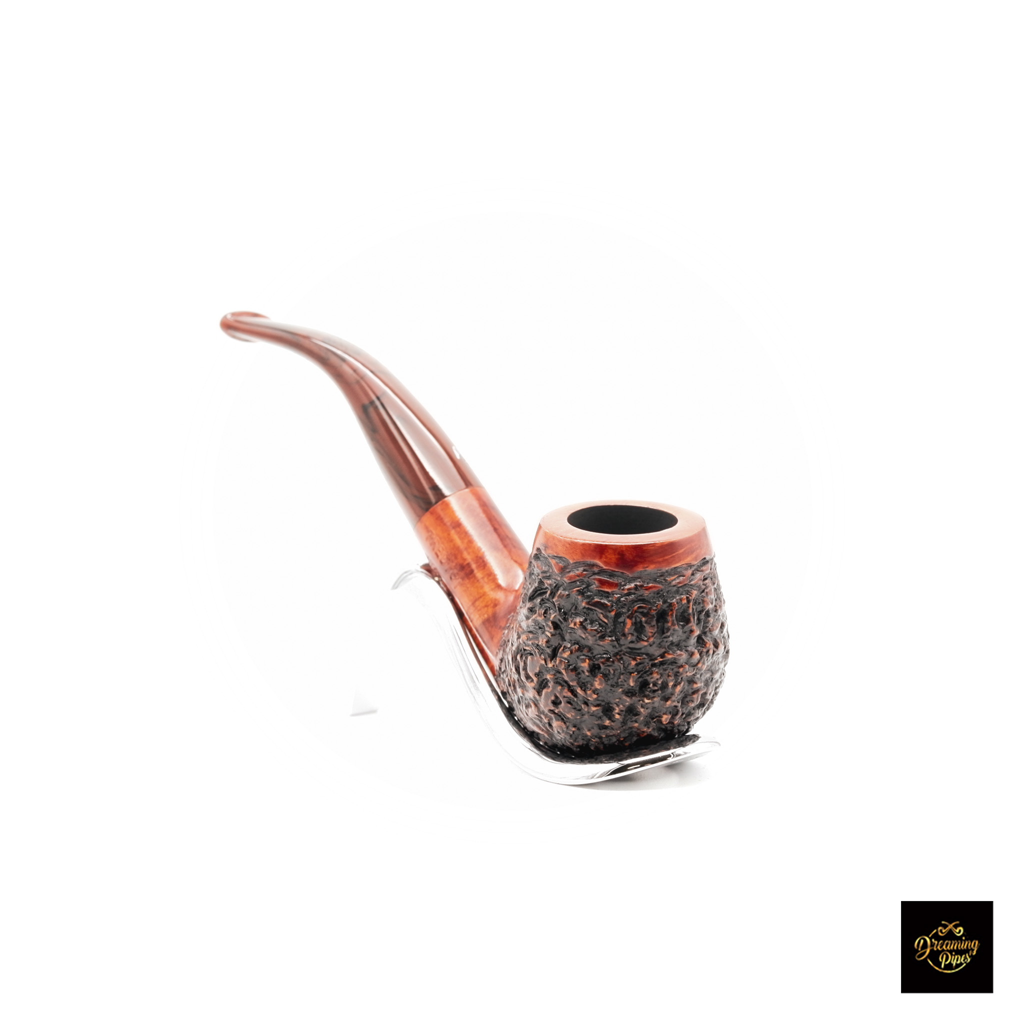 The Ascorti Italia Carved Tredici is a beautifully designed Italian pipe that showcases a masterful blend of smooth and rusticated finishes. The bowl features intricate rustication, providing a rugged texture that contrasts elegantly with the polished rim and shank, emphasizing the rich grain of the briar. The warm reddish-brown tones complement the darkened, deeply textured portion of the bowl. Paired with a sleek, slightly curved acrylic stem, the pipe offers both visual balance and ergonomic comfort. This pipe is ideal for collectors and connoisseurs who appreciate fine craftsmanship and a unique, sophisticated aesthetic.