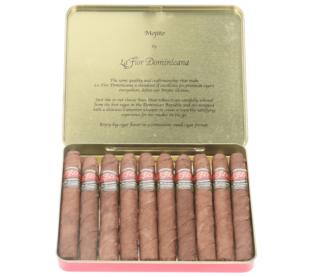 La Flor Dominicana Mojitos are petit-sized machine-made cigars in one of the most flavorful blends in the world today. LFD Mojitos are medium-bodied with a sweet aroma and impeccable construction. Made with the finest blend of Dominican filler and binder estate-grown tobaccos. Therefore, the result is an unforgettable smoking experience unlike any other you’ve experienced with small cigars. Mojito stands out as a complex and flavorful smoke on the smoother side with bountiful taste notes and an easy draw. Certainly, these small yet flavorful smokes are for any time of the day. The pocket-sized aluminum tins provide the ideal protection for traveling with your cigars.