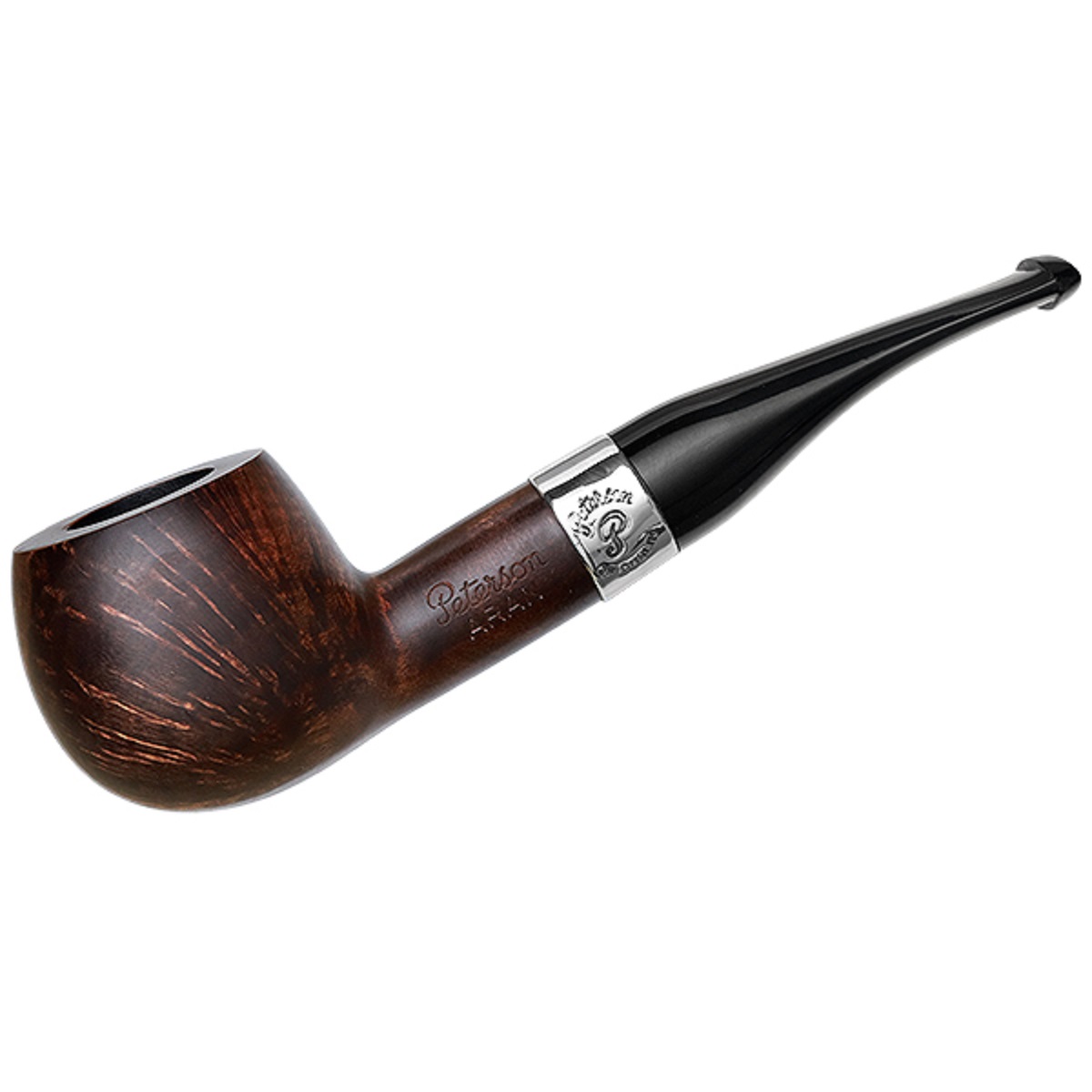 Peterson’s “408” combines elements from the Author, Prince, and Bent Apple, offering a classic profile with unique touches. The voluptuous bowl and robust shank reflect the muscular aesthetic of the Irish marque, providing a substantial in-hand feel. The Aran finish features a rich chocolate stain, jet-black stem, and a nickel band for a formal, sophisticated appeal while highlighting the briar’s natural grain.