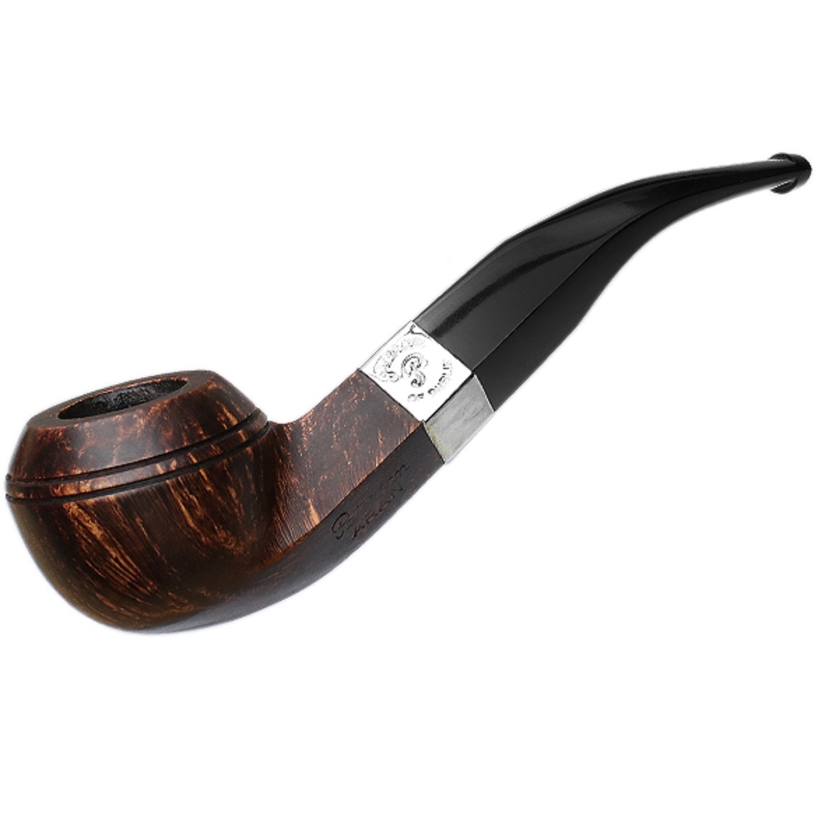 Peterson’s “80s” is a bold, muscular version of the classic bent Bulldog, featuring a thick, sturdy shank with a low-slung bowl and signature beadlines around its rim. It mirrors the “999” Rhodesian with a similar squat bowl and masculine proportions. The Aran finish offers a rich chocolate stain paired with a sleek jet-black stem and a nickel accent band for a refined, understated look.