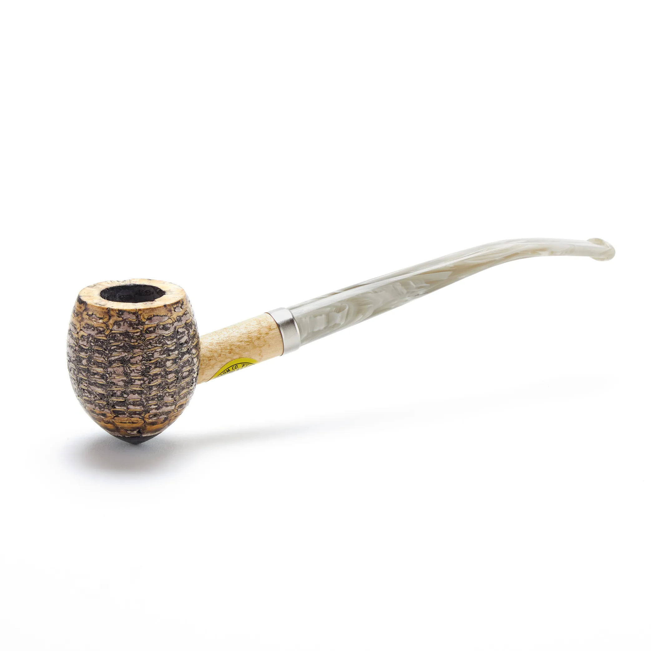 It has an acorn-shaped bowl that’s not only pleasing to behold, but pleasing when held in the palm of your hand. Like all pipes in the Cobbit Collection, the bowl has a dark stain added to the coating, a genuine, hardwood insert in the bottom, a wide nickel band on the shank, and a Smoky Grey Italian acrylic bit.