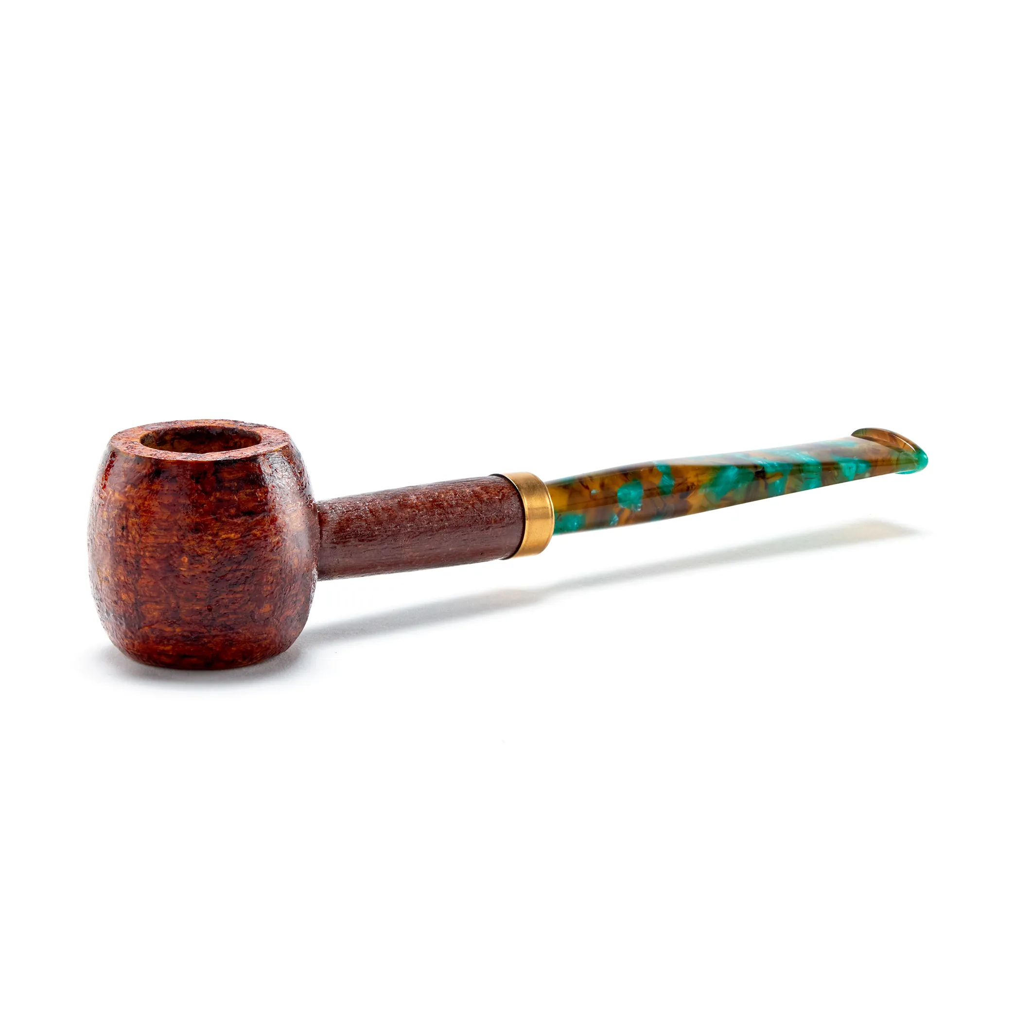 This caramel colored beauty feels like a piece of gold in one’s hands! With the shank capped by an antique brass band and our green tortoise Italian Fantailed acrylic bit, it will look as nice as one too.