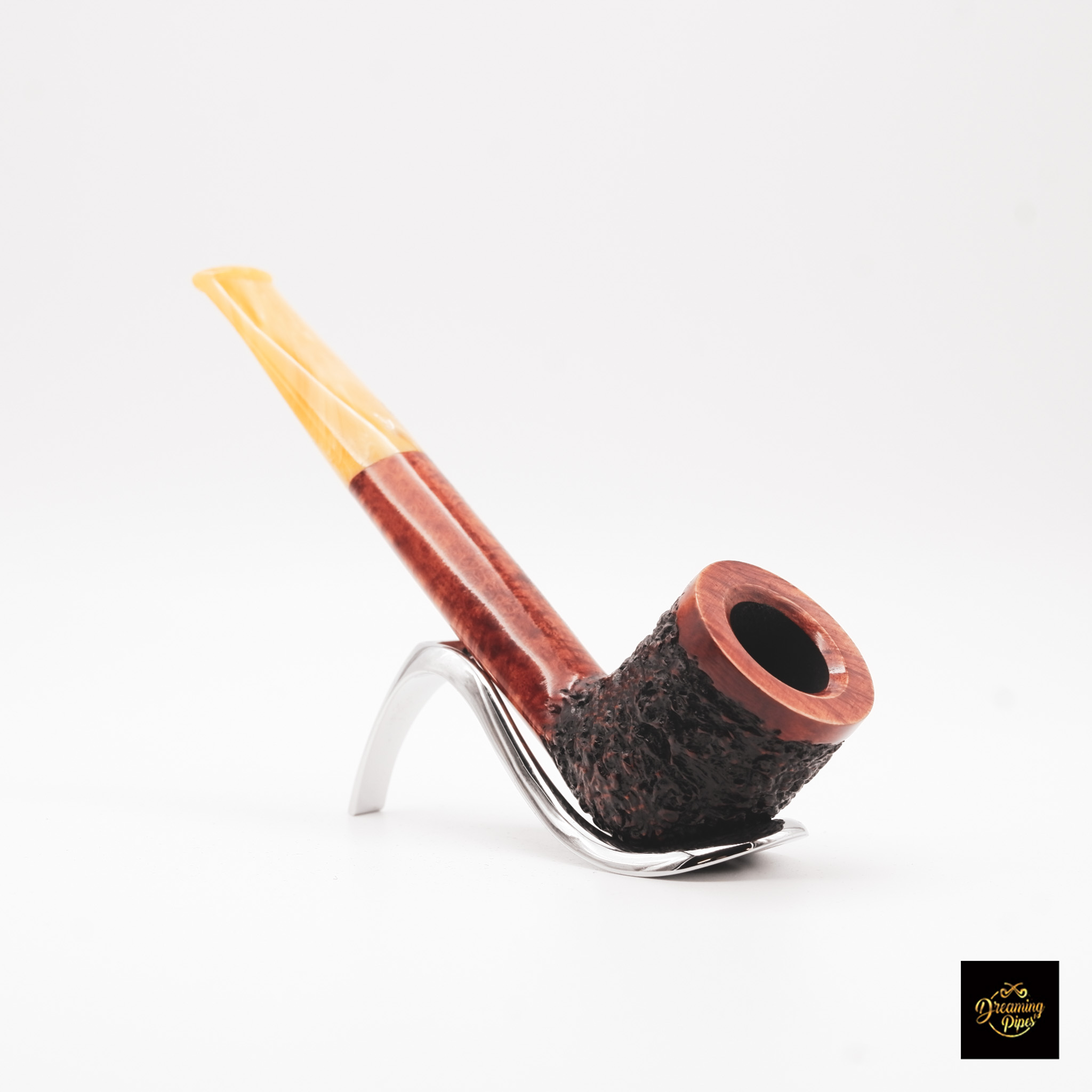 The Ascorti Italia Carved Undici is a remarkable Italian pipe that combines traditional craftsmanship with striking design elements. The bowl features a deeply textured rusticated finish, which contrasts beautifully with the smooth, polished rim. The warm reddish-brown tones of the briar extend gracefully into the long shank, which is accentuated by the unique, amber-toned acrylic stem. This elegant combination of dark and light hues creates a visually appealing contrast, while the slightly bent stem provides a comfortable smoking experience. This pipe is an excellent choice for connoisseurs who appreciate both aesthetic appeal and fine craftsmanship.