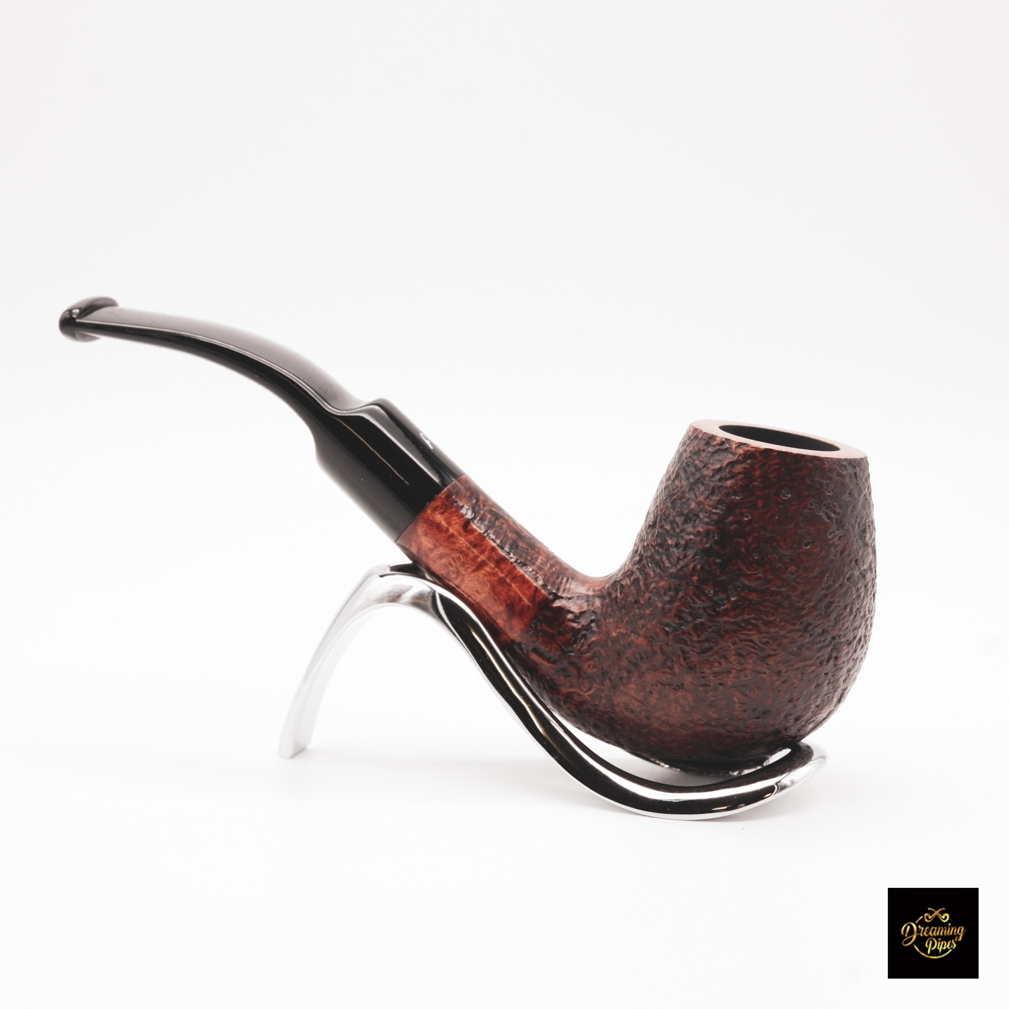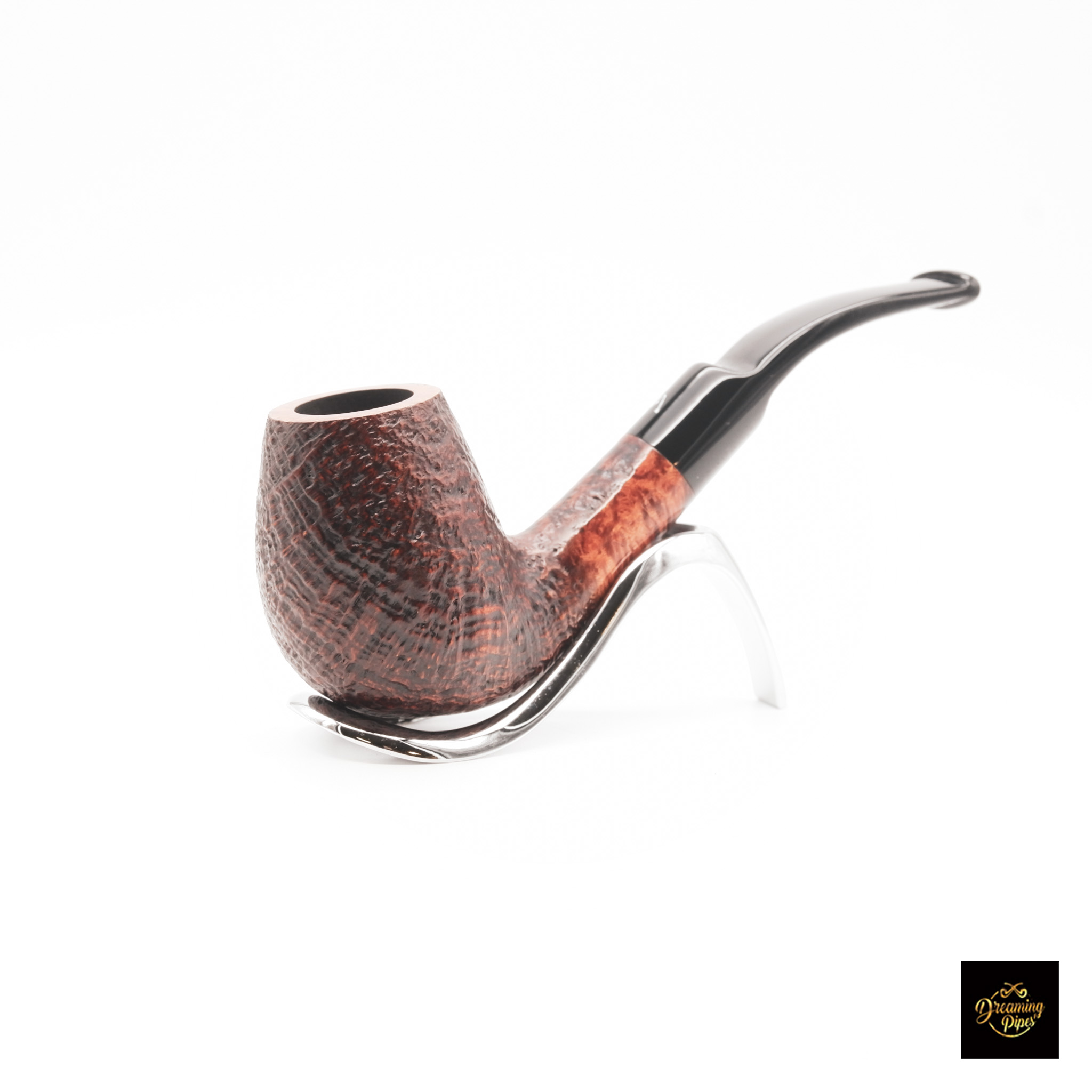 The Ascorti Italia Sand Otto is an exquisite hand-crafted pipe made in Italy, featuring a sandblasted finish with a rich, reddish-brown tone. The bowl displays intricate texture and grain, giving it a rugged yet elegant appearance. Its curved stem, which connects seamlessly to the bowl, provides a comfortable smoking experience, while the black acrylic mouthpiece offers durability and a sleek contrast. This pipe’s ergonomic design is both visually appealing and functional, resting comfortably in hand or on its included metal stand, making it an ideal choice for pipe enthusiasts who value artistry and craftsmanship.