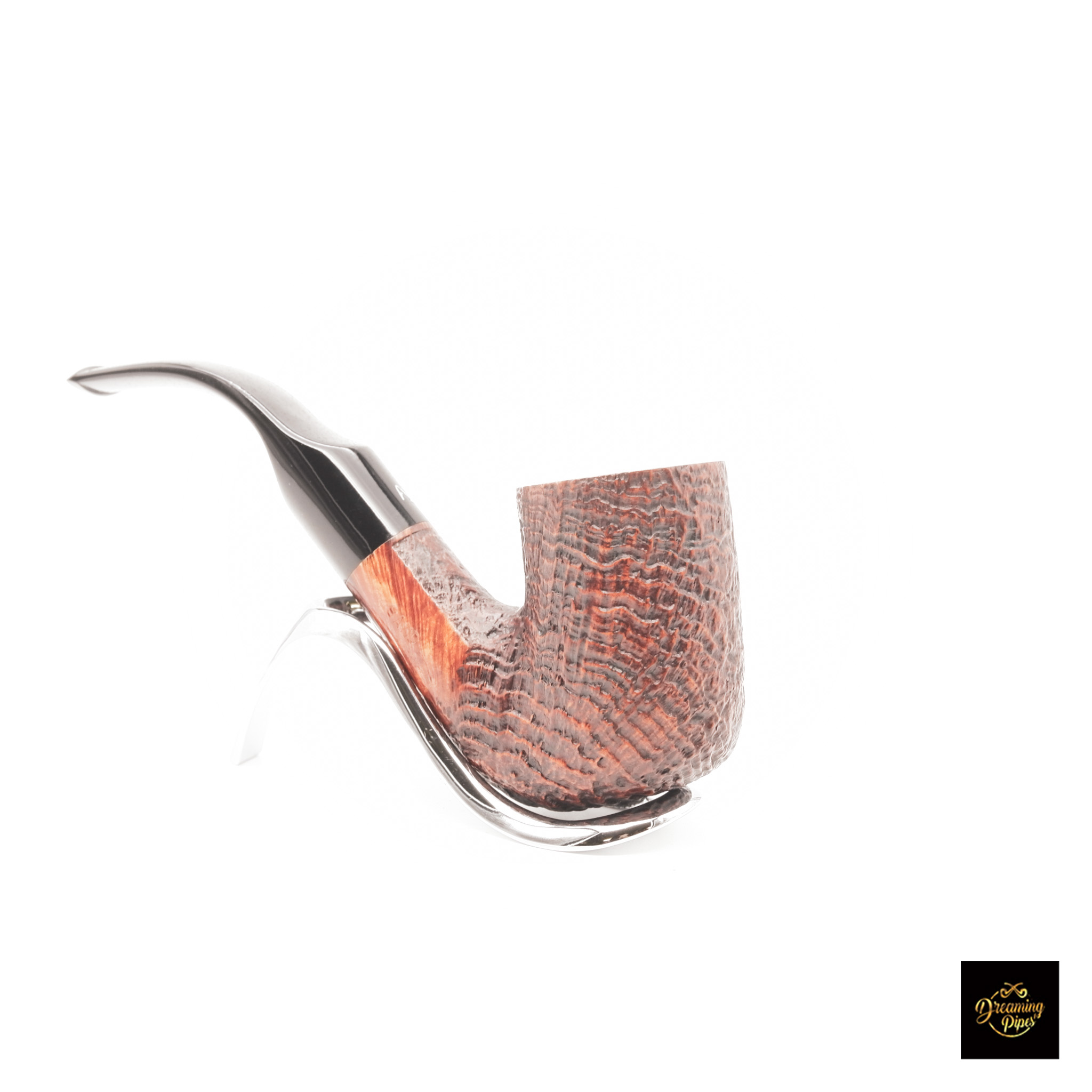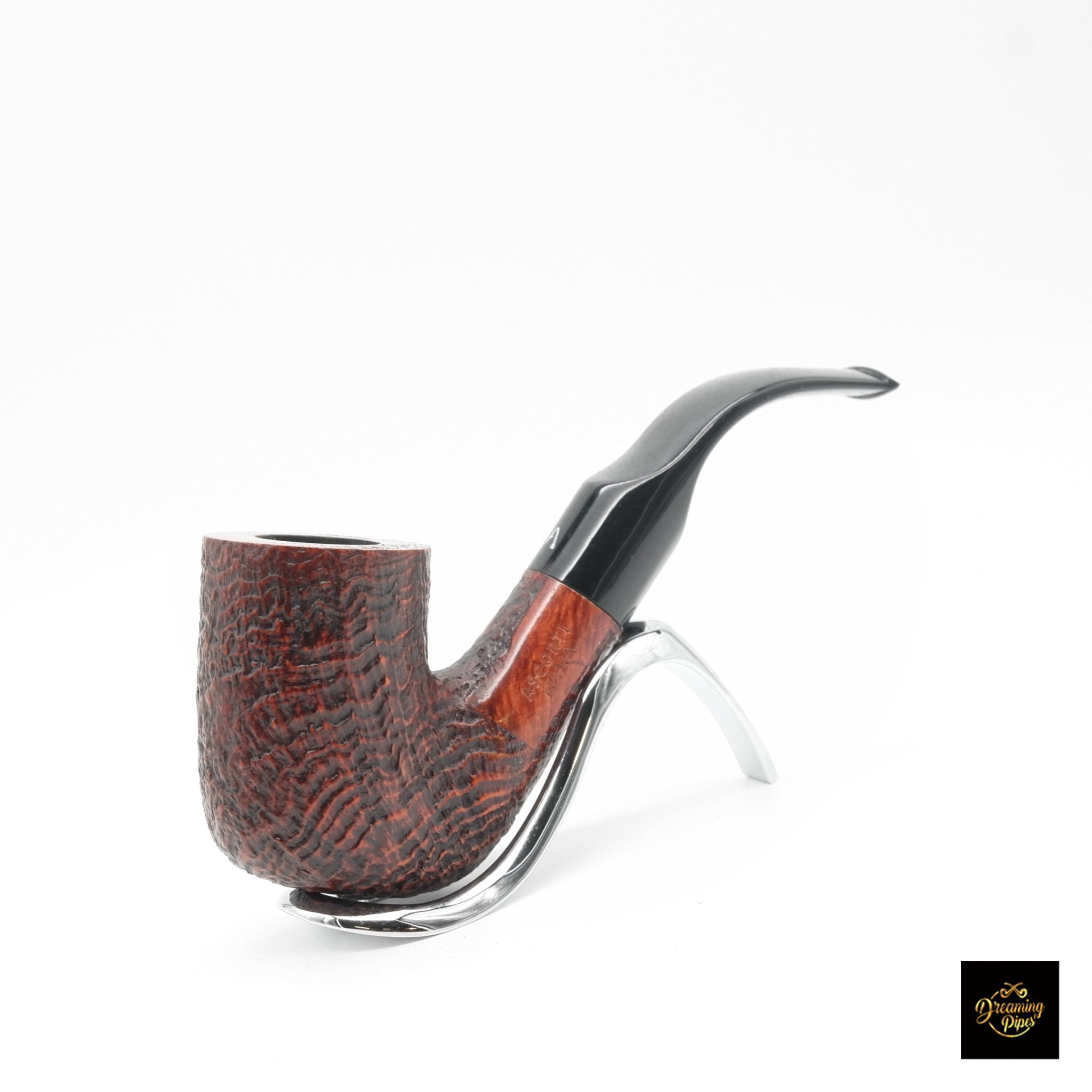 The Ascorti Italia Sand Sei is a beautifully hand-crafted pipe that boasts a striking sandblasted finish, revealing the natural grain of the briar wood. Its deep, earthy tones give it a rustic yet refined look, while the smooth rim adds a touch of polish to the design. The bowl’s textured surface provides a comfortable grip, enhancing the smoking experience. The black acrylic stem complements the rich wood, curving gracefully for ergonomic handling. This Italian-made pipe is perfect for both collectors and everyday smokers, offering a balance of artistry, functionality, and durability.